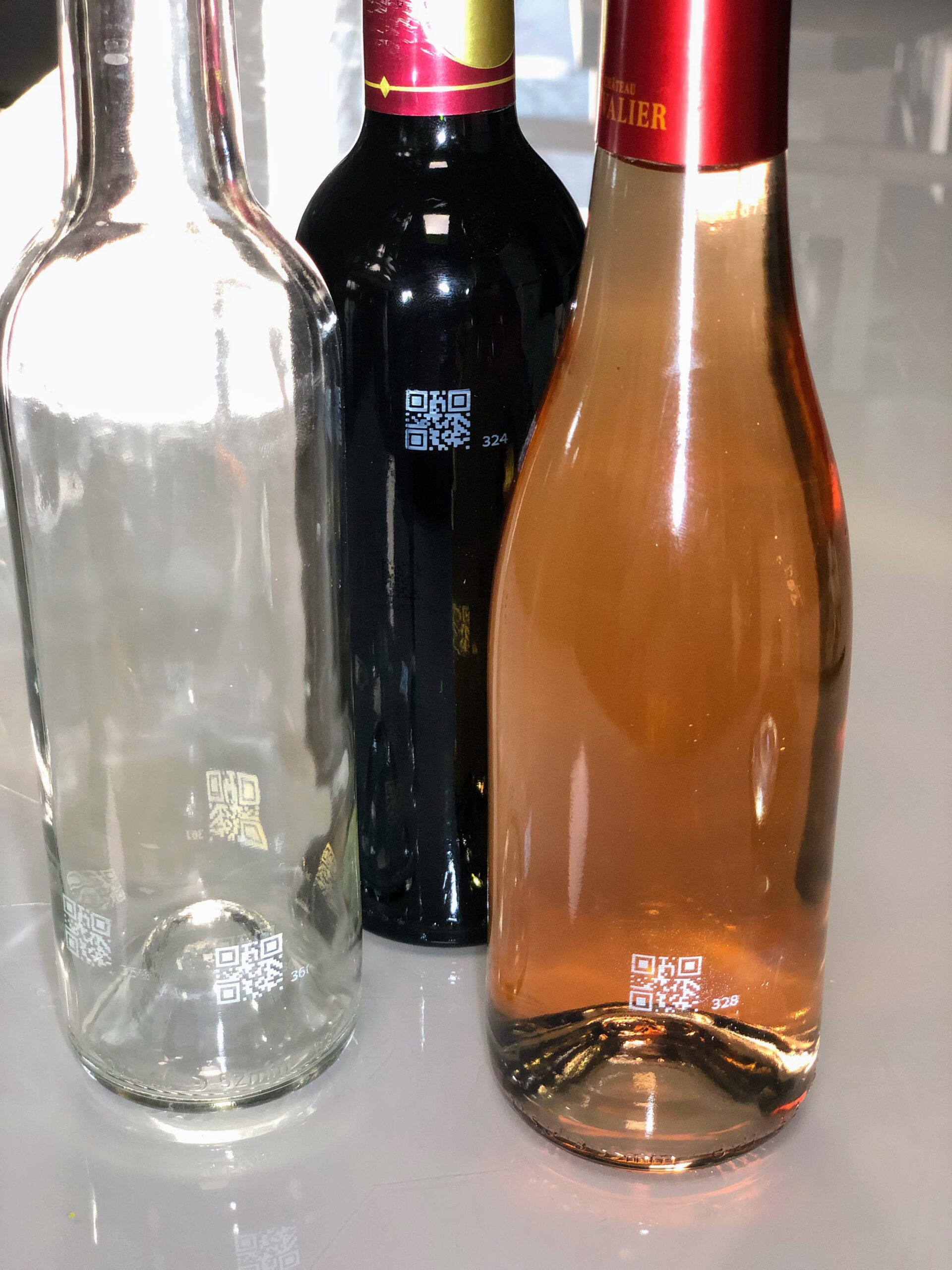 Nous avons réalisé un marquage qui s’accroche de manière indélébile au verre et qui est lisible à haute cadence avec un lecteur optique.