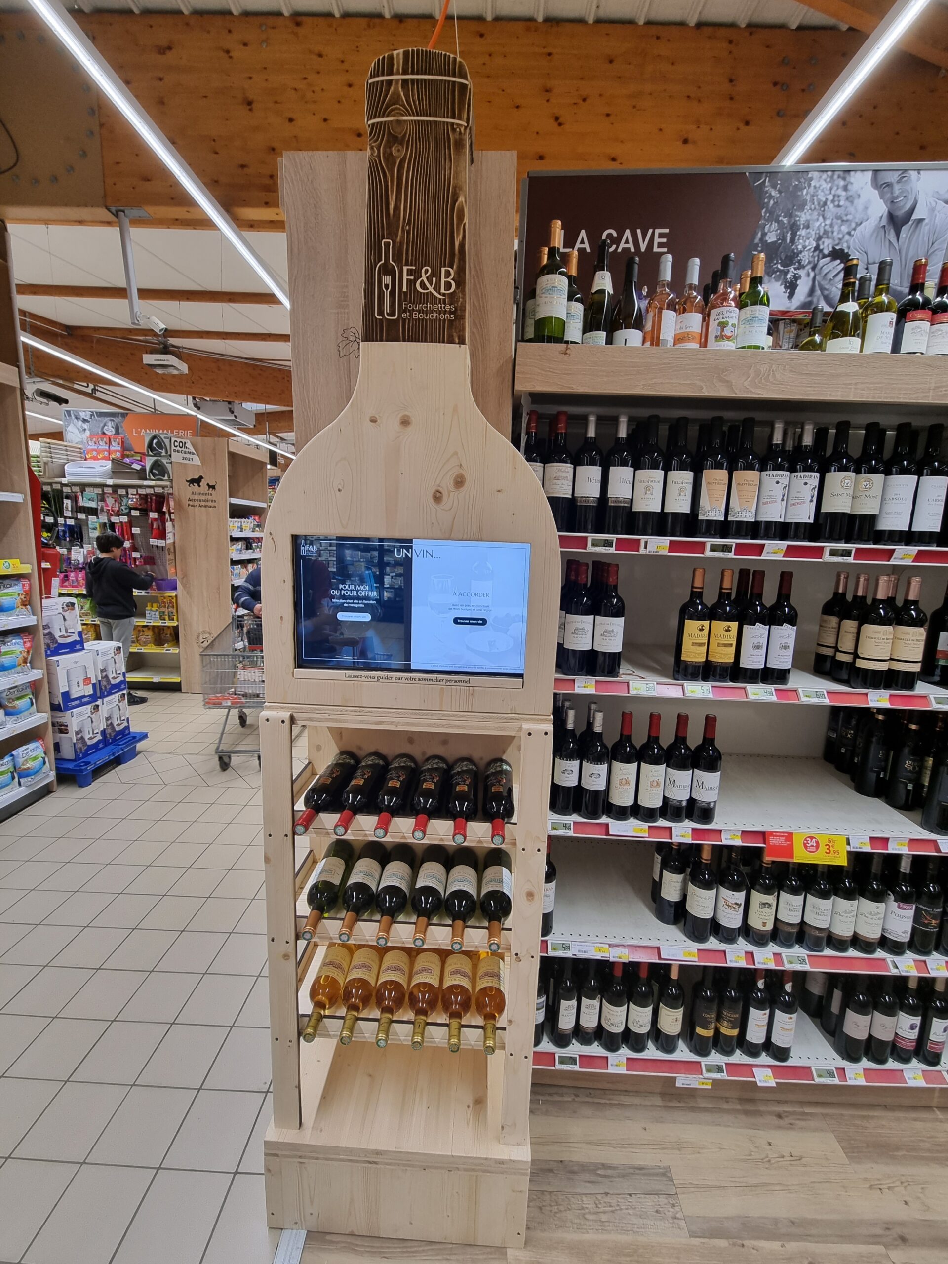 C’est une borne interactive installée dans le rayon vin des grandes surfaces, là où il y a besoin de conseil. Quand vous cliquez, deux entrées vous sont proposées. « Vin pour moi ou pour offrir » vous demandera de répondre à un questionnaire rapide… « Vin à accorder » : vous inscrivez le plat que vous cherchez à accorder.