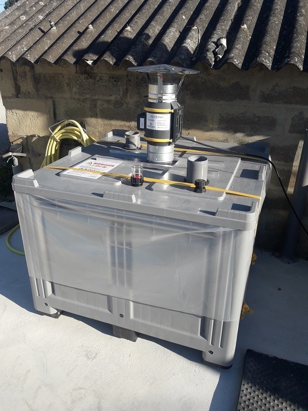 Notre système est aujourd’hui le plus économique : il est clé en main (le producteur peut installer lui-même le système), utilise des matériaux standards, et se fixe sur n’importe quelle cuve fermée. Il n’y a que le coffret électrique que l’on fait fabriquer pour des raisons de qualité. Notre premier kit commence à 800 € H.T. Pour une caisse palette, il faut compter 1 750 € H.T. Nous avons élargi la gamme à des cuves inox, et nous pouvons aussi fournir des cuves allant jusqu’à 6 000 litres. La plus grosse cuve que nous ayons équipée fait 20 000 litres. À Cognac, elle évapore 10 000 litres d’effluents chaque année. Ceci a coûté 4 000 € à l’agriculteur. Si le client possède une ancienne cuve qu’il n’utilise plus, nous pouvons la réutiliser et l’équiper.